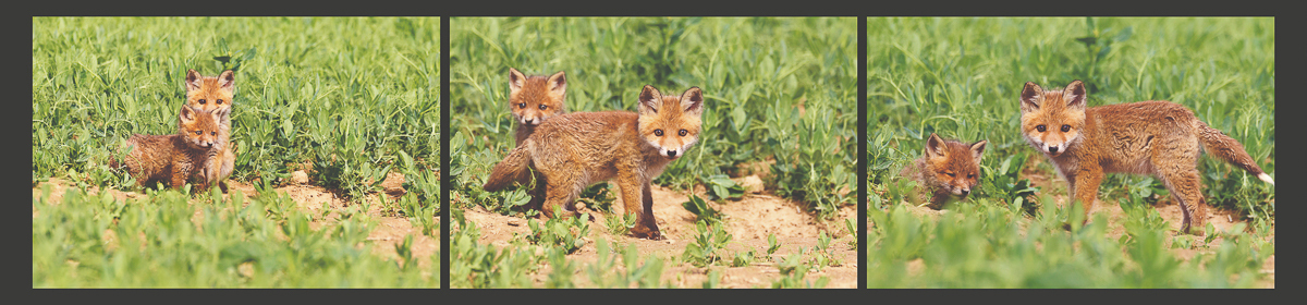 Dieses Triptychon fängt die die Unbeschwertheit und entspannte Natur der Fuchswelpen ein und vermittelt eine hoffnungsvolle Perspektive auf neues Leben. Mit kunstvollen Aufnahmen, die die unbekümmerte Begegnung zwischen Tier und Betrachter zelebrieren, schafft das Bild eine einzigartige Verbindung zwischen Kunst und Natur. Die großformatige Darstellung (44*190 cm) unterstreicht die Detailverliebtheit und die emotionale Kraft dieser faszinierenden Tierfotografien.